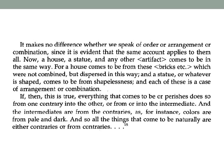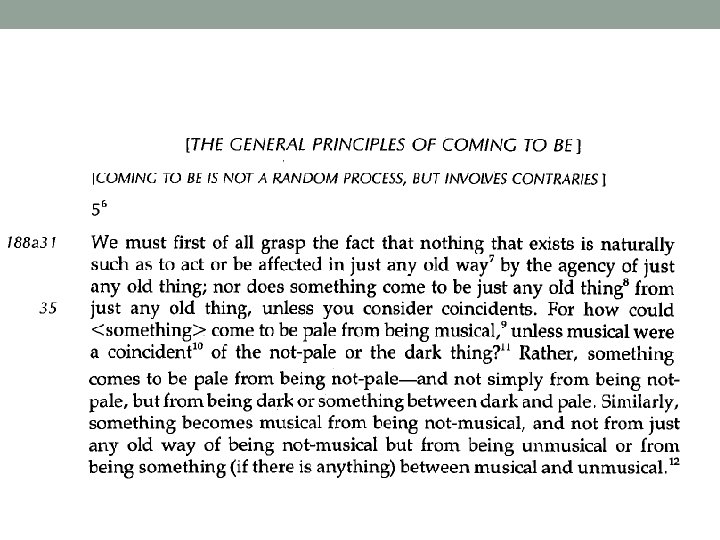 What is clear by nature • What is more perspicuous and better known by nature (τὰ σαφέστερα • • τῇ φύσει καὶ γνωριμώτερα, Physics 1. 1, 184 a 17 -18) What is clear to the learner What is clear by nature = What is clear in itself What are things by nature clear to us? Are they formulations such as principles or elements? Or compounds such as perceptible objects? “We may take him as saying: ‘of the ultimate constituents of matter, pure water, pure fire, or whatever they may be, we know little; about things like houses and doctors, on the other hand, we are fairly clear; let us begin, then, with them, and see what emerges, from a discussion of such familiar objects, about basic principles. ’” (William Charlton, Aristotle Physics Books I and II, 2006, 52)