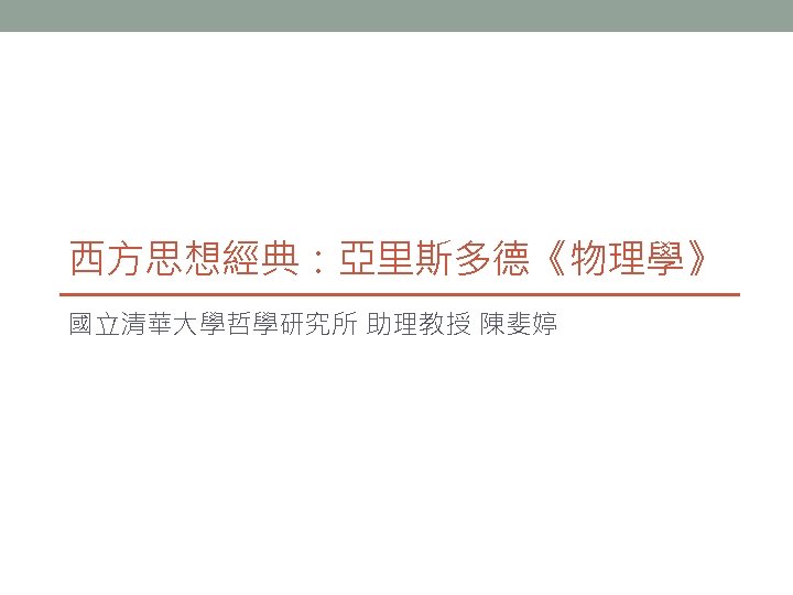 Names in relation to their accounts • “We perceive individuals, but our perception is of the universal, e. g. , of man (or perhaps of a man) not of the man Callias (Analytic Posterior 2. 19, 100 a 16 -b 1). ” (Charlton, 52) On the other hand, De Anima 2. 6 suggests that forms like man are not strictly objects of perception. • Name (ὄνομα) • Account (λόγος) • Names in relation to their accounts A name like man indicates a number of features such as animal, rational, mortal, which appear separately in the definition (Philoponus, c. 490 -c. 570, 6 th century Aristotelian commentator)