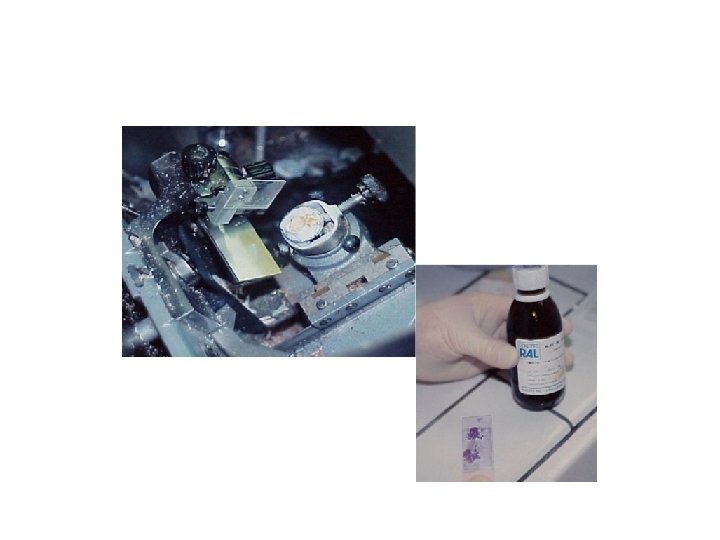 Du prélèvement…. à la lame! • L'hématéïne (hématoxyline) colore les acides nucléiques en violet. • L'éosine qui teinte en rose les cytoplasmes • La safran colore le collagène en jaune. • N. B: on routine, on utilise une coloration HE. • A la fin, on procède à un montage de lamelles sur lames.