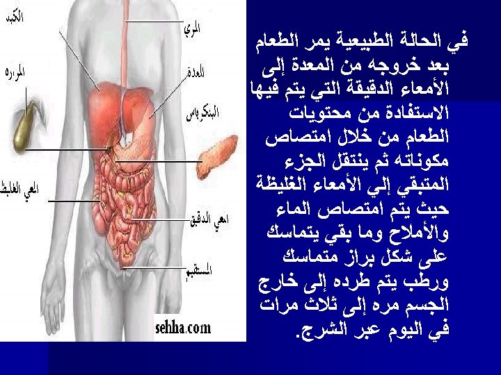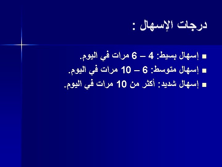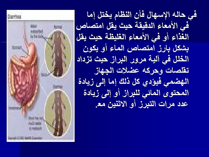 Types of diarrhea : Acute Watery Diarrhea: (80% of cases) n This refers to diarrhea that begins suddenly; it persists for 3 4 days then gradually improves over another 4 - 5 days. It is usually self-limited (lasts less than 14 days) and involves the passage of frequent loose or watery stool without visible blood. Dysentery: (5 – 10% of cases) n This is diarrhea with visible fresh blood in the stools. Its sequelae include anorexia and damage to the intestinal mucosa. Persistent Diarrhea: (10% of cases) n Post infectious diarrhea that begins actually and lasts at least 14) days. Persistent diarrhea is not chronic diarrhea which is recurrent or long- lasting due to non-infectious causes. (e. g. metabolic disorders).