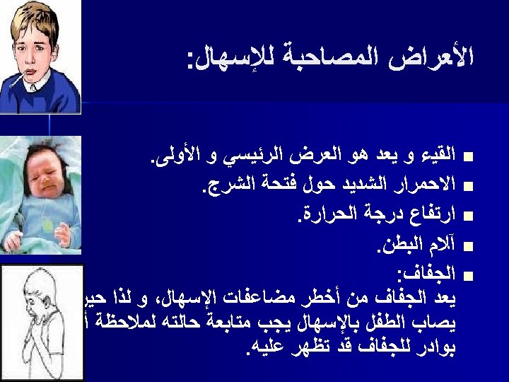 Presence or absence of mucus, pus or blood in stool. n Patient's ability to drink and or presence of thirst. n Presence of vomiting, fever or other problems (cough, otitis media). n Last time urine passed. n Feeding practices before and during illness. n Treatment during this episode (ORS, drugs). n Vaccination taken especially measles vaccine. 2 - Assessment of the degree of dehydration: n Assessment of the degree of dehydration is based on 4 signs which are the most important to be detected: n