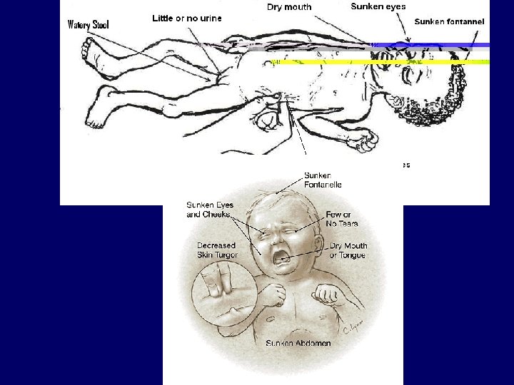 Other signs that are used in the assessment of dehydration are: Anterior fontanel: normal, depressed or severely depressed. n Mucous membrane of the mouth and tongue: moist, dry or very dry. n Tears: present in mild dehydration, absent in severe dehydration. n Pulse (radial) as dehydration increase, pulse becomes more rapid. In severe dehydration pulse becomes weak. n Extremities: in severe dehydration, skin becomes cool and moist and the nail bed may be cyanosed. n Breathing : rapid deep breathing is a sign of acidosis. Weighing is essential as it helps to estimate the amount of fluid required, for an initial rehydration. Patient should be weighted to the nearest 50 – 100 grams at the beginning of the assessment and recorded. Towards the end of rehydration , the child should have gained weight. n