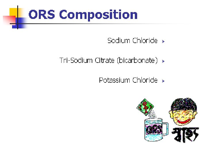 Composition of ORS : Components g/1 Amount G/L Sodium chloride. 3. 5 G/L Trisodium citrate. 2. 9 G/L potassium chloride 1. 5 G/L Glucose 20. 0 G/L