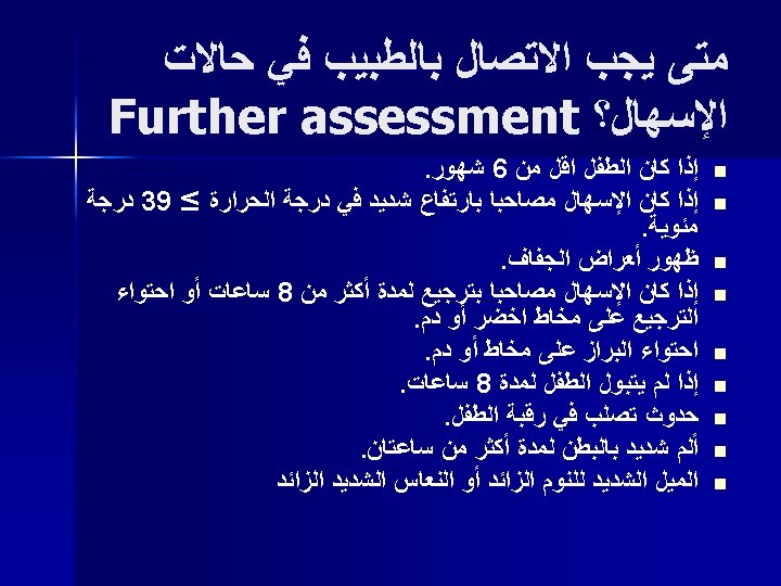 Further assessment A) Advice the mother to bring the child to a health facility if : -Frequent large stools. -Repeated vomiting -Increased thirst -No improvement after days -Bloody stools. -Fever. B) Reassess the patient's condition. -If no signs of dehydration shift to plan A. -Some dehydration shift to plan B -Severe dehydration shift to plan C.