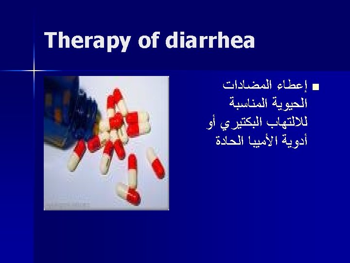 Drugs therapy in diarrhea : 1 - Antibiotic are ineffective and may lead to( prolonged diarhea –cause malabsorptionhave side effect – prolong the duration of infection – their abuse will increase the resistance of organism). 2 - Anti - diarrheal drugs. 3 - Anti -motility drugs. 4 - Anti – emetics.