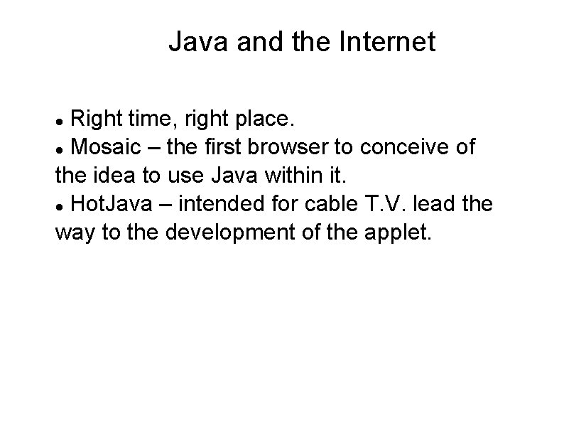Java and the Internet Right time, right place. Mosaic – the first browser to conceive of the idea to use Java within it. Hot. Java – intended for cable T. V. lead the way to the development of the applet.