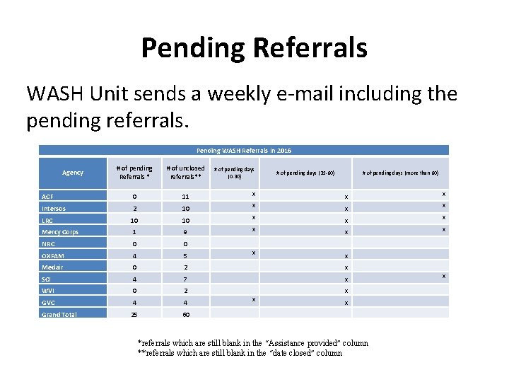 Pending Referrals WASH Unit sends a weekly e-mail including the pending referrals. Pending WASH Referrals in 2016 # of pending Referrals * # of unclosed referrals** ACF 0 11 Intersos 2 10 LRC 10 10 Mercy Corps 1 9 NRC 0 0 OXFAM 4 5 Medair 0 2 SCI 4 7 WVI 0 2 GVC 4 4 Grand Total 25 60 Agency # of pending days (0 -30) x x x x # of pending days (31 -60) # of pending days (more than 60) x x x x x *referrals which are still blank in the “Assistance provided” column **referrals which are still blank in the “date closed” column x x x