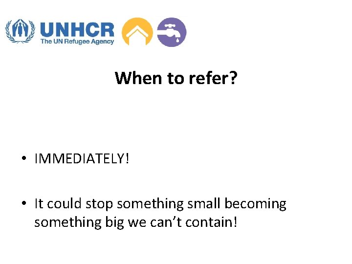 Why do we refer? • Protection • To prevent a serious outbreak • Key surveillance tool to prevent possible outbreaks of WASH related diseases • Improve the life of refugees • To hold partners accountable in their activities