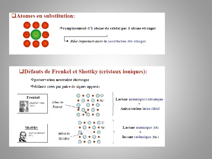 Les défauts cristallins Les défauts ponctuels: Les défauts ponctuels sont des défauts limités à un nœud du réseau. Il sont de dimension 0 : le rayon atomique est très petit devant les dimensions du cristal. A : lacune B : atome étranger intersticiel B’: auto-intersticiel C et C’: atomes en substitution