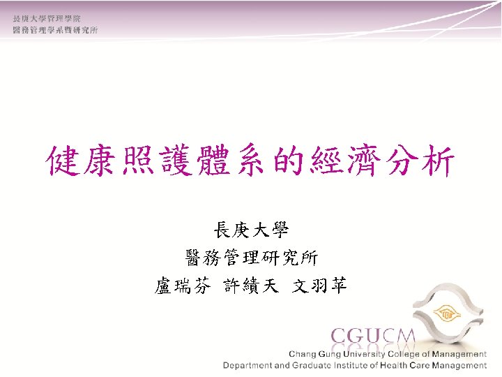 Introduction - lecturers • 盧瑞芬 – 現職: 長庚大學醫務管理學系教授 – 學歷: • 臺灣大學公共衛生學系學士 • Harvard School of Public Health – M. S. in Health Policy and Management – Sc. D. in Health Economics
