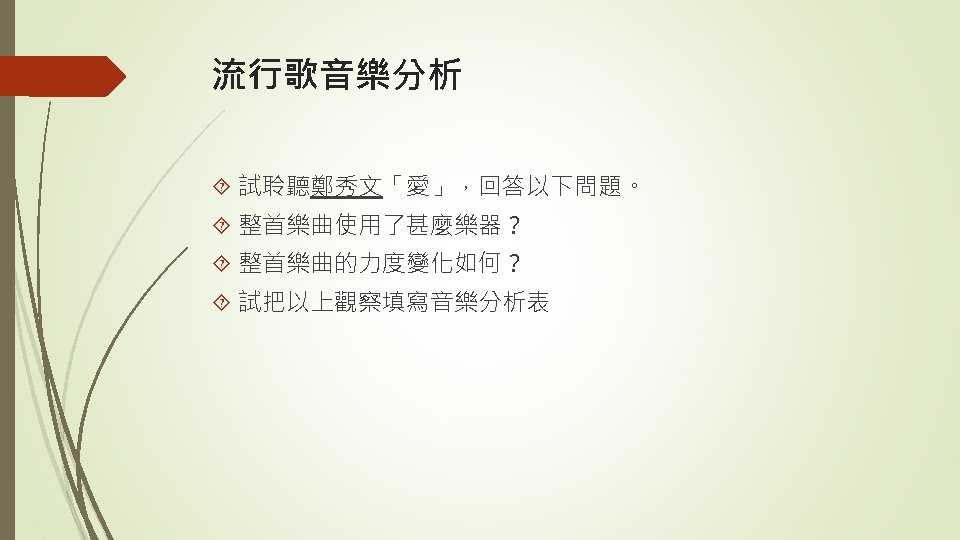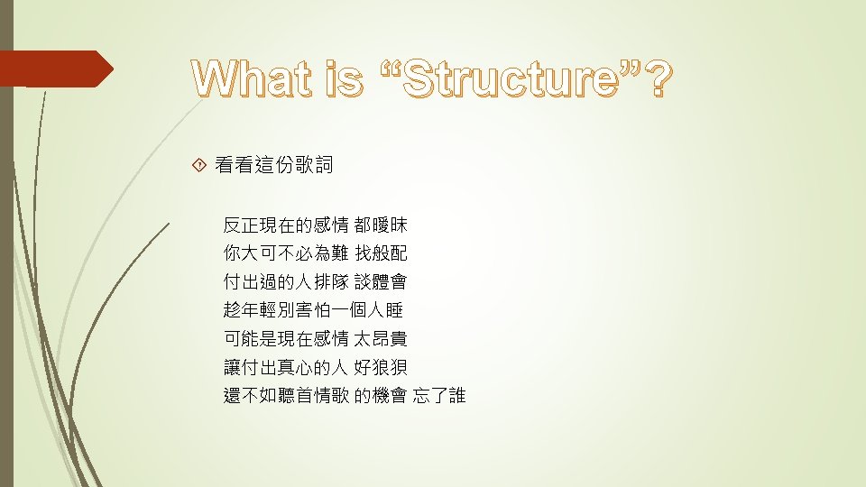 What is “Structure”? Structure 結構 = how a piece of music is divided into sections樂曲分為不 同段落, 段落之間有對比 Classiacl: AB (binary二段體), ABA (ternary三段體), ABACA (rondo迴旋曲式) Compemporary: introduction(前奏), verse(正歌), chorus(副 歌), bridge(過門), pre-chorus(? ? ? ) and outro(尾奏)