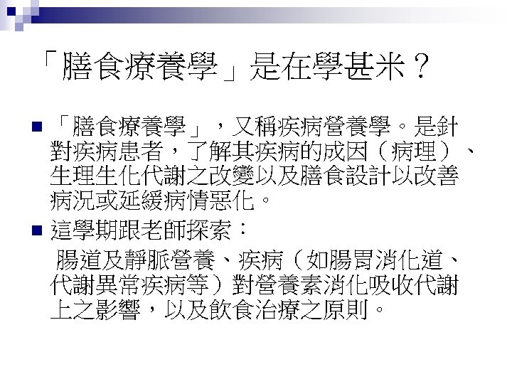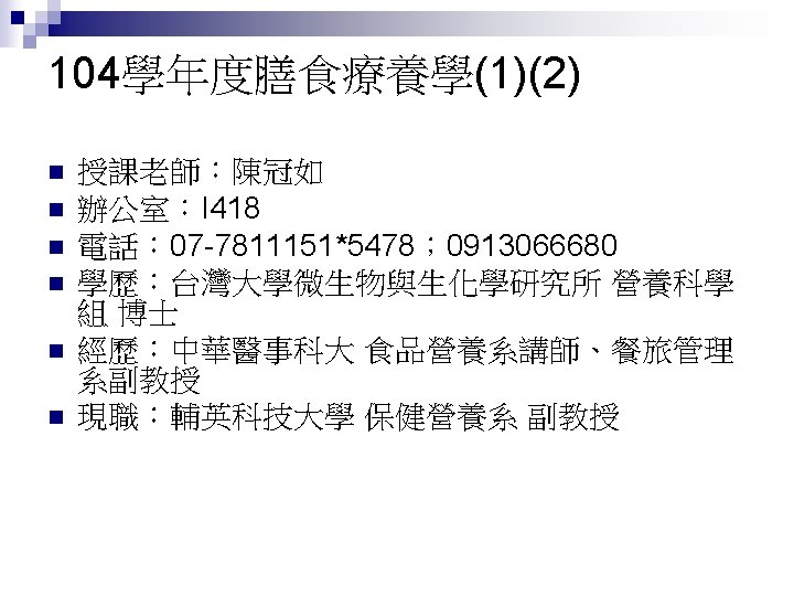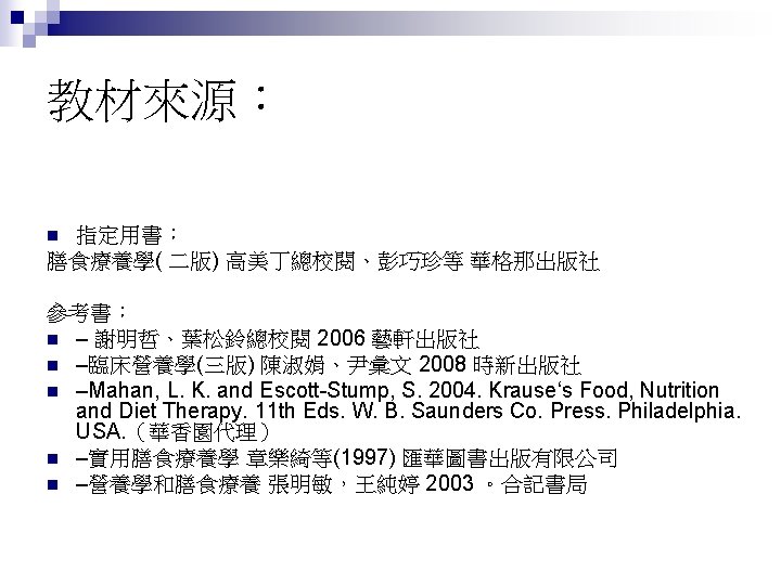 膳食療養學(二)課程內容 Nutritional Care in Diseases of Liver, Exocrine Pancreas and Biliary System Renal Disease and Dietary Management Cancer Dietary Management Gastro-Intestinal Disease of Nutritional Care Physiological Stress and Nutrition Care-Sepsis, Trauma, Burns, and Surgery Therapy for Anemia Management Nutrition Care of Pulmonary Disease Endocrine Disorder and Neurologic Disease of Nutritional Care