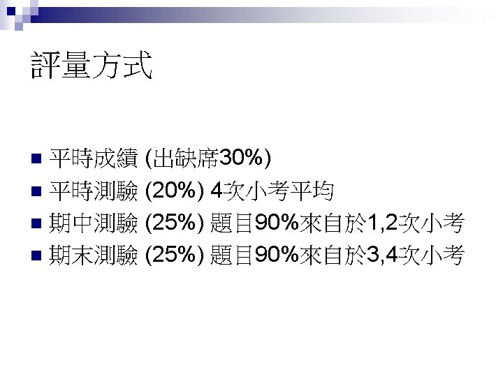 授課大綱 膳食療養學(一)課程內容 Introduction Nutritional Assessment Nutritional care Therapeutic diet Nutrition support- Exchange List, EN&TPN Body Weight Control and Dietary Management / Cardiovascular Disease and Dietary Management Diabetes Mellitus and Dietary Management