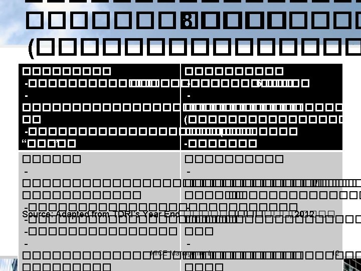 Services Liberalization • AFAS: ASEAN Framework Agreement on Services • Protocol to Implement Package of Commitments Under the AFAS – 7 th. Package (2009), 8 th. Package (2010) • No Restriction for Mode 1 and Mode 2 • Progressively remove other Mode 3 Market Access Limitation by 2015 • Allow for ASEANMICEEquity Participation Management 11