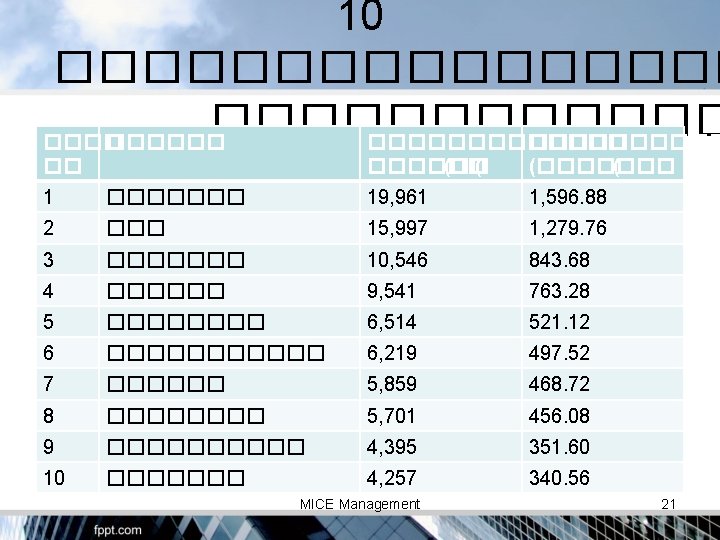 ASEAN Single Market : ������� • • • Free flow of Goods Free flow of Services Free flow of Investment Free flow of Capital Free flow of Skilled Labor MICE Management 9