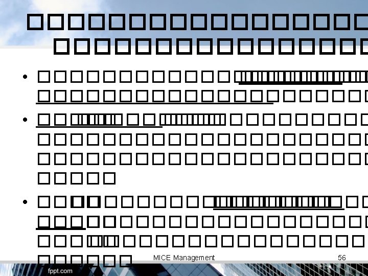 Multiple Benefits MICE Industry Visitor Spending Venue, Organizer, Hotel, Shopping, Travel, destination Trade & Investme nt Trade, Investment, Positive Image MICE Management Knowledg e Transfer Knowledge & Technology transfer 55
