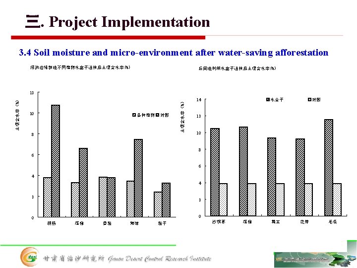 三. Project Implementation Through the water-saving afforestation experiments by water-boxx, plant surviving ratio is improved 10 -90% in 6 landtypes, average surviving ratio was improved 25% and more,the soil moisture is lower and environment is harsher, plant surviving ratio is more higher. Generally, Plant surviving ratio situation are low land among dunes>semi-fixed sandy land>moving dunes area> abandoned land>mountainous slope area>farmland than the control(contrast).