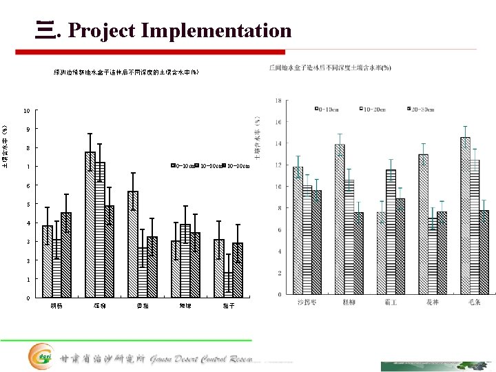 三. Project Implementation 3. 2 Plant species selection v Desert plant species:Picea mongolica, Pinus sylvestris var. Mongolica, Pinus Pinea, Sabina vulgaris, Prunus Mongolica, Populus euphratica, Elaeagnus angustifolia, Hippophae rhamnoides, Haloxylon ammodendron, Caragana korshinskii, Hedysarum scoparium, Calligonum mongolicum, Caragana sinica, Tamarix ramosissima, Ulmus pumila, Ammopiptanthus mongolicus, Atraphaxis bracteata, Nitraria tangutorum, Zygophyllum xanthoxylum. v Mountainous tree species: Picea crassifolia, Sabina przewalskii, Picea mongolica v Vegetable plant species:eggplant, pepper, tomato. 24 plant species in total joined in the experiments.