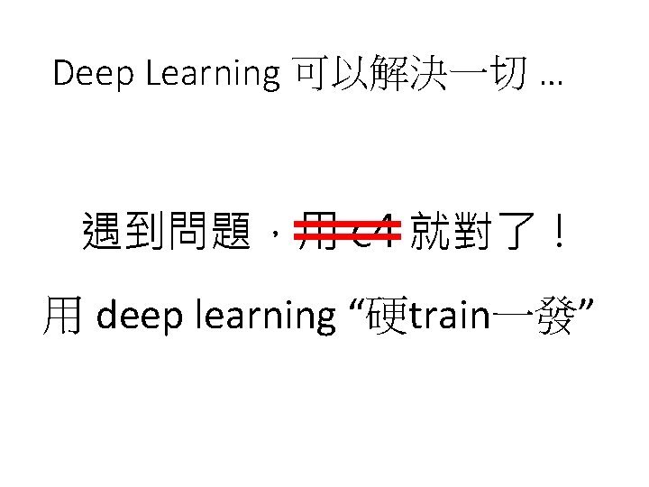 Practice of Deep Learning • Previous machine learning developers • Carefully design your algorithm • Theoretically know its performance • Deep learning • Try first • Many results contradict our intuition • Find some reasons to explain what we observed • More like chemistry • Or even worse ……