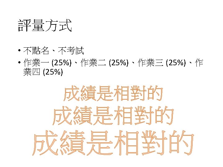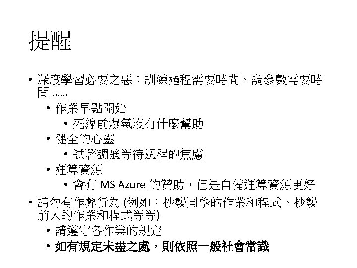 四次作業 • HW 1:深度學習流言終結者 • 1 -1: Deep is better than shallow? • 1 -2: Is local minima an issue? • 1 -3: Is deep learning generalizable? • HW 2:Seq-to-seq model • 2 -1: Video caption generation • 2 -2: Chat-bot (option)