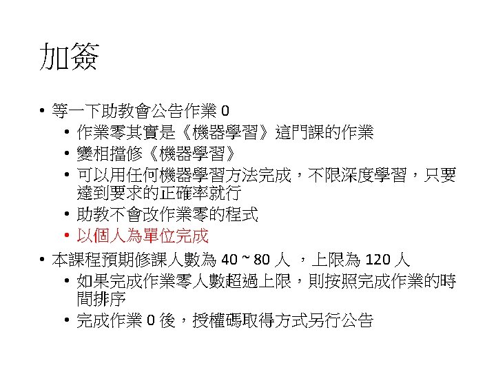 需要的基礎能力和知識 • 本課程的定位為機器學習進階課程 • 程式能力:能夠使用某一個深度學習框架 (e. g. Tensorflow, py. Torch) • 使用 Keras 無法完成所有的作業 • 本學期不會教深度學習框架的使用,請自學 • Tensorflow • https: //fgc. stpi. narl. org. tw/activity/video. Detail/4 b 1141305 d 9 cd 2 31015 d 9 d 07 dbe 1002 a • https: //fgc. stpi. narl. org. tw/activity/video. Detail/4 b 1141305 d 9 cd 2 31015 d 9 d 0852 c 5002 b • https: //fgc. stpi. narl. org. tw/activity/video. Detail/4 b 1141305 d 9 cd 2 31015 d 9 d 08 fb 62002 d • py. Torch • https: //fgc. stpi. narl. org. tw/activity/video. Detail/4 b 1141305 d 9 cd 2 31015 d 9 d 0992 ef 0030