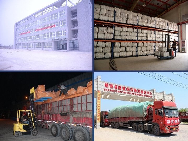 Varieties of existing reserves for central-level disaster relief materials in China n 1. 救灾帐篷 Tents 单帐篷 unlined tents: 12、20、36、60 sm 棉帐篷 dispatched tents: 12、20、36 sm n 2. 棉大衣 Cotton-padded coats n 3. 棉被 Cotton-padded quilts n 4. 睡袋 Sleeping bags n 5. 折叠床 Folding beds n 6. 折叠桌凳 Folding tables and chairs n 7. 简易厕所 Portable toilets n 8. 场地照明设备 Ground lighting n 9. 苫布 Tarpaulin n 10. 应急灯 Emergency lights