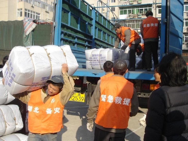 n 商务部门负责保障灾区生活必需品市场供应 Ministry of Commerce: supply of necessities n 质量监督部门负责提供有资质的检验机构名单,配合做好救 灾物资质量把关检验 作 General Administration of Quality Supervision, Inspection and Quarantine: providing list of inspection body, assisting in quality inspection n 食品药品监管部门负责指导检验机构做好灾区食品、瓶桶装 饮用水、药品等救灾物资质量检验 作 Food and Drug Administration: quality inspection for food, drinking-water, and drug