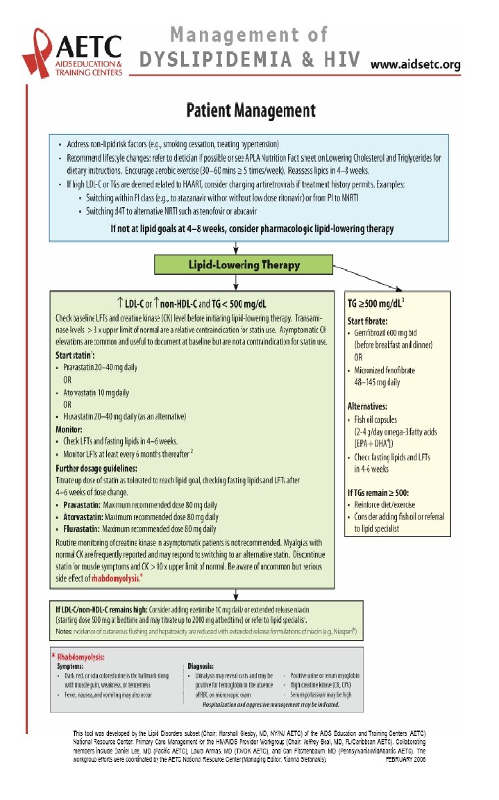 Tools Background l Intended to be a practical guide l Primarily based on ACTG/IDSA guidelines for managing dyslipidemia in HIV patients l Developed through contributions from HIV specialists, with expertise in metabolic complications and experience in HIV primary care and education (all AETC faculty)