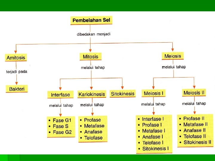 TAHAPAN MITOSIS 1. v v v INTERFASE : FASE ISTIRAHAT FASE G 1 FASE S FASE G 2 2. v v KARIOKINESIS : FASE PEMBELAHAN INTI PROFASE METAFASE ANAFASE TELOFASE 3. SITOKINESIS : FASE PEMBELAHAN SITOPLASMA