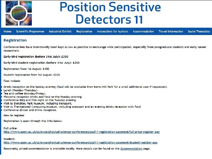 PSD 11 Timeline • • • o • • • Email with doodle for NOC meeting 5/8/16 NOC Meeting on 29/9/16 Invitations for new members of NOC and IAC (IAC contacted last time: Joe Hill, Nobu Unno, Hongbo Zhu, Paula Collins, Takaki Hatsui, Oswald Siegmund, Bernd Schmitt, Heinz Graafsma, Thierry Nuns, Michael Campbell and Edoardo Charbon) NOC also suggested names of Keynote Speakers (13 at PSD 11 roughly one per topic) by 8/11/16 23/2/17 Call for abstracts opens and poster finalised with 1/5/17 as abstract closing date 60 abstracts, so abstract submission deadline extended to 31/5/17 getting to 120 abstracts Presenters contacted to say abstract accepted as Oral, Poster or Rejected by 29/6/17 Registration (see next slide)