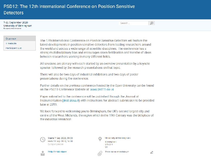Conference Series available at https: //indico. cern. ch/category/9007/ This event also advertised at https: //indico. cern. ch/category/6725/ Link can also be found at the Radiation Hard Semiconductor Devices for Very High Luminosity Colliders web pages https: //rd 50. web. cern. ch/rd 50/ Also at the European Committee for Future Accelerators Detector Panel (ECFA-DP) https: //ecfa-dp. desy. de/ Public Documents: Schools, Conferences and Workshops: https: //syncandshare. desy. de/index. php/apps/onlyoffice/s/t 6 TGb 6 W 7 x 2 ER 4 Qe? file. Id= 240670514 Our draft web pages are coming together at: https: //www. birmingham. ac. uk/facilities/mds-cpd/conferences/psd 12/index. aspx