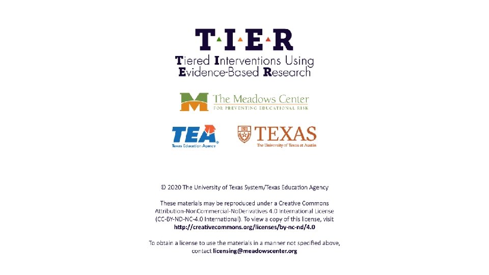 Progress-Monitoring Data • Use line graphs to track student progress-monitoring data. • Connect progress-monitoring data to documented instruction and interventions. • Resource: Collaborative instructional logs https: //buildingrti. utexas. org/resource-pages/collaborative-instructional-logs • For more information about progress monitoring and making data-based instructional decisions, explore the following TIER modules: • Progress Monitoring • Decision Making