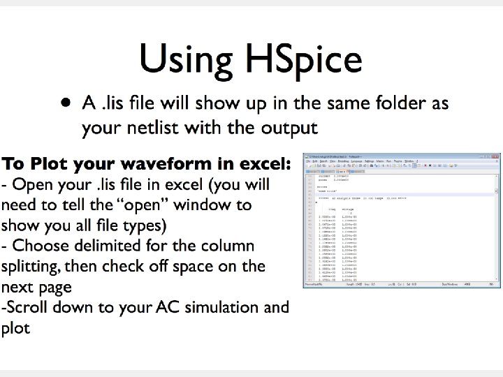 WORKFLOW • Create an Spice input file that describes the circuit • Run Spice • Inspect the output