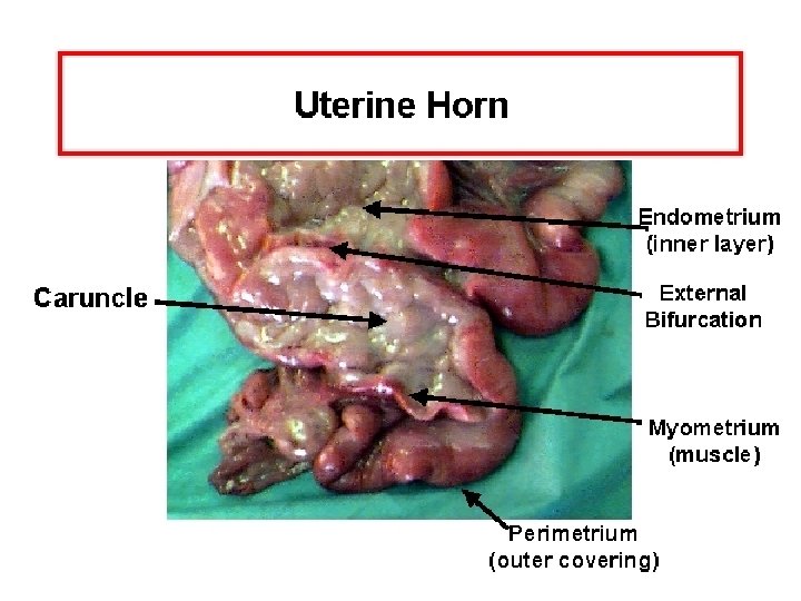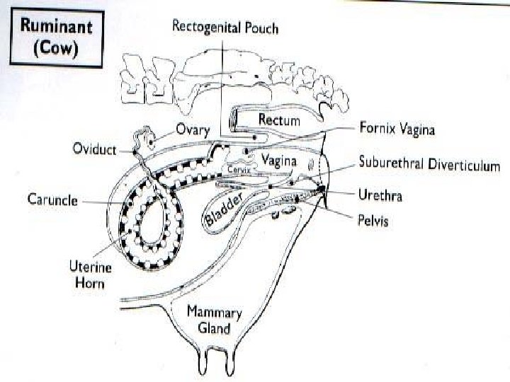 Uterus n n Enlarged part of the tract in which embryos come to rest Divided in to 3 parts: 1. Uterine Horn : n n n 80 -90% length of uterus in Ruminant. The junction between 2 horns make uterine body. Disposition also varies (in Ruminant). 2. Uterine body : n n small in ruminant. Area common to both sides of female tract. 3. Cervix.
