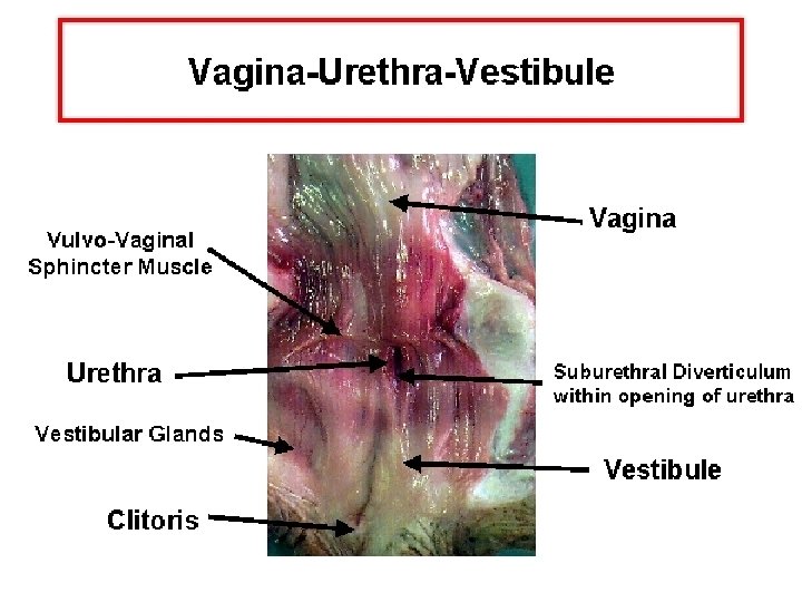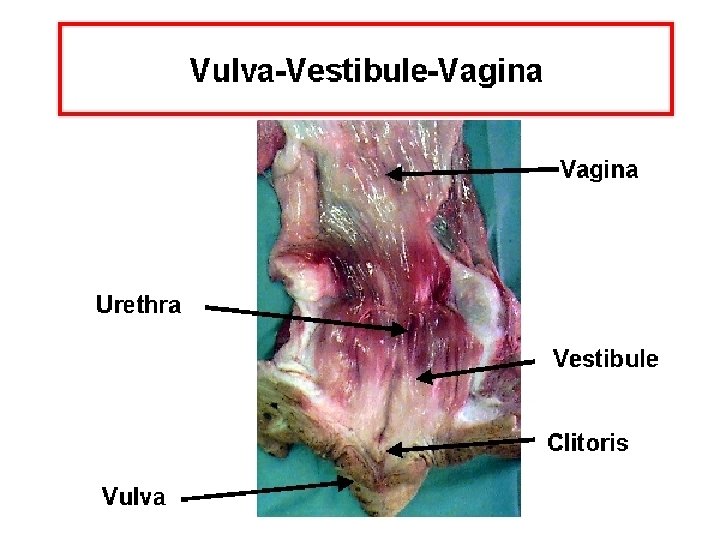 Vestibule and Vulva n External Genitalia of Female. I. Vestibule n n n Run from Urethral orifice to the external Vulva. The wall less elastic than those in the Vagina. The Urethra orifice associated with blind pocket a Suburethral diverticulum (in Ruminant) Vestibular wall are marked by the entrance of the ducts of Vestibular Glands (in Ruminant). region common to reproductive & urinary systems.