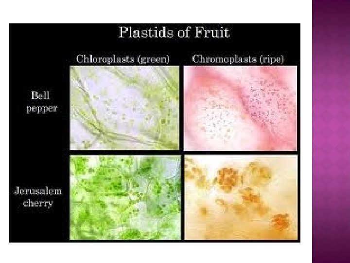 � Etioplasts are pre-granal, immature chloroplasts but can also be chloroplasts that have been deprived of light, lack active pigment and can be considered leucoplasts. After several minutes exposure to light, etioplasts begin to transform into functioning chloroplasts and cease being leucoplasts. � Chromoplasts are found in fruits, flowers, roots, and stressed and aging leaves, and are responsible for their distinctive colors. This is always associated with a massive increase in the accumulation of carotenoid pigments. The conversion of chloroplasts to chromoplasts in ripening is a classic example. � Chromoplast are heterogeneous organelles responsible for pigment synthesis and storage in specific photosynthetic eukaryotes.