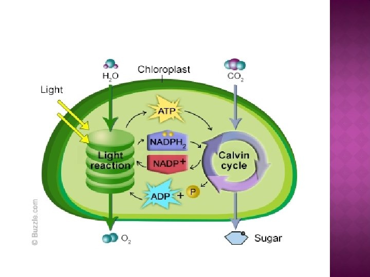 � The light-dependent reactions of photosynthesis occur in the grana where photosynthetic pigments like chlorophyll a, chlorophyll b, carotenoids, etc. absorb light energy, which is then used to break down water molecules, and ultimately give rise to ATP, NADPH 2 and oxygen. � The stroma of chloroplasts is the site for the dark reactions of photosynthesis. The enzymes in the stroma utilize carbon dioxide from the atmosphere, as well as the ATP and NADPH 2 molecules released from grana, to synthesize sugar molecules and starch. This process is also known as carbon dioxide fixation, and occurs through a series of reactions collectively called Calvin cycle