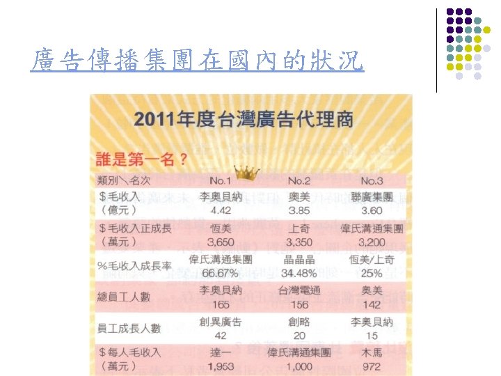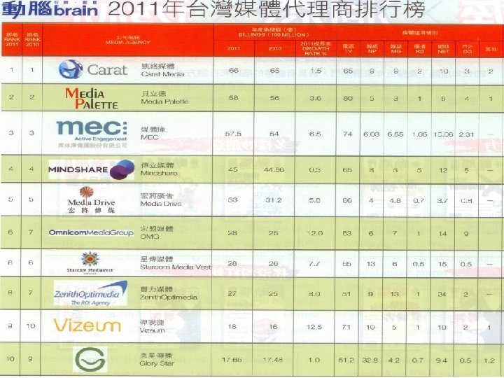 Advertising Agency l l l Has strategic and creative expertise, media knowledge, workforce talent, and negotiating abilities In 2002 -2003 ad agency gross income was $10. 6 billion worldwide. (Advertising Age) Advertising Age - Agency Family Trees