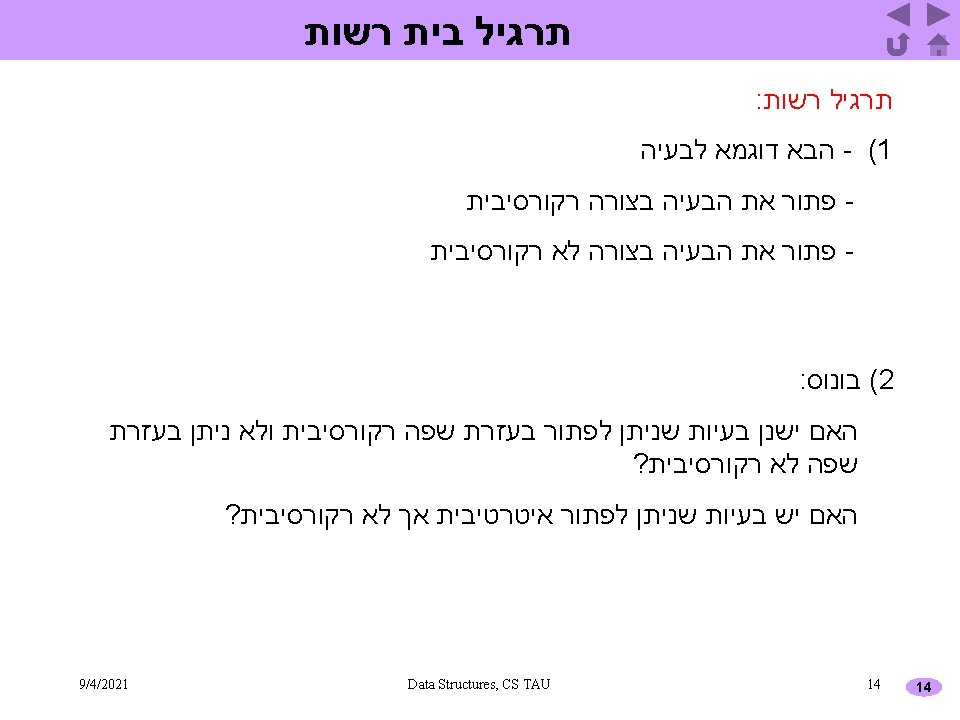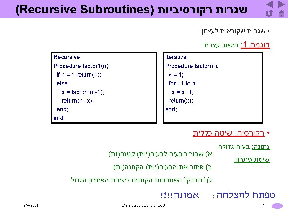 – מיון מערך 6 דוגמא MAXALL בהנחה שממומשת השגרה SORT(N) מיון מערך פתרון איטרטיבי Do I= N to 1 by -1 CALL MAXALL(I) end; פתרון רקורסיבי Proc SORT(N) /* sorts the elements A(1)…. A(N) */ if N = 1 return else begin CALL MAXALL(N); CALL SORT(N-1); end; 9/4/2021 Data Structures, CS TAU 13 13