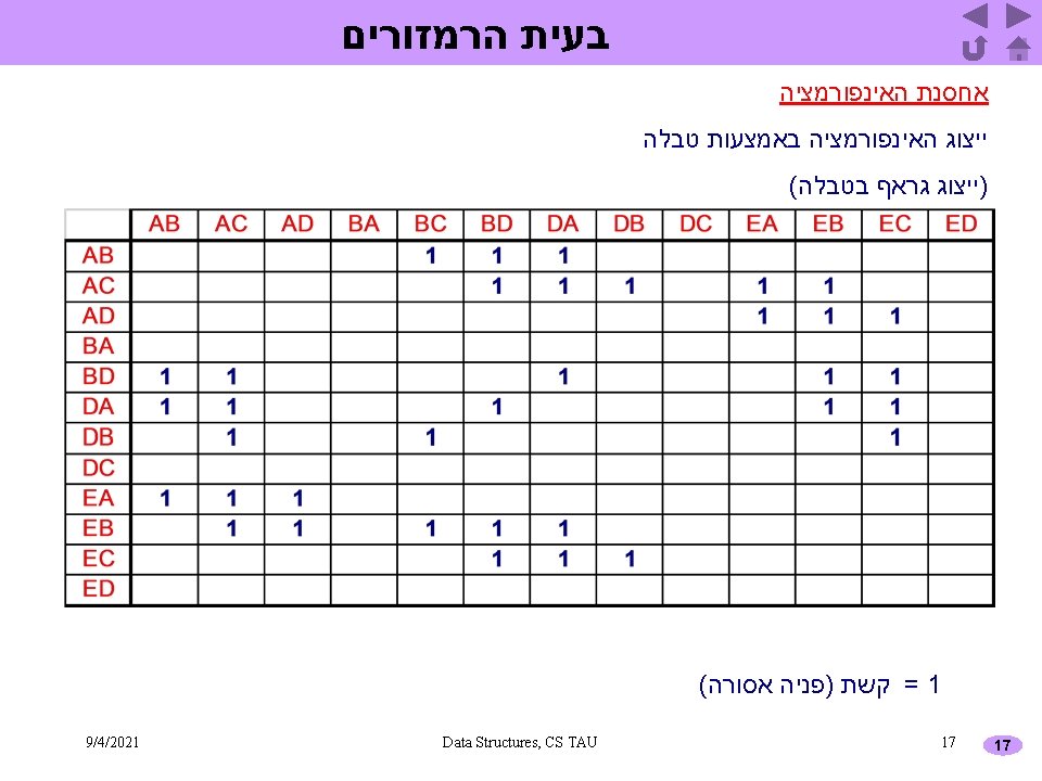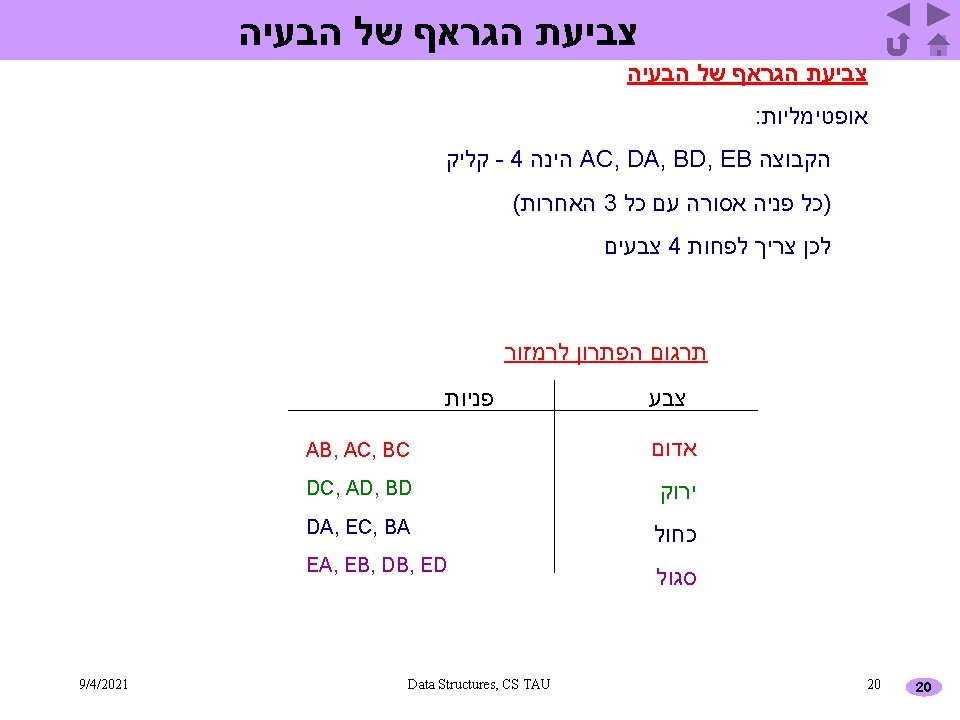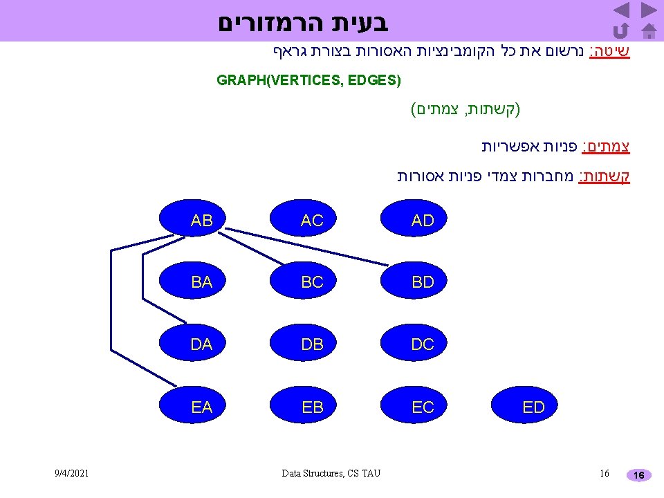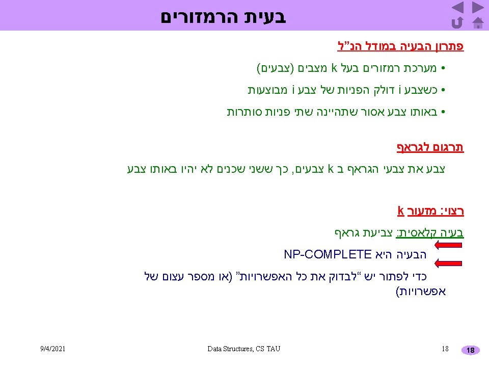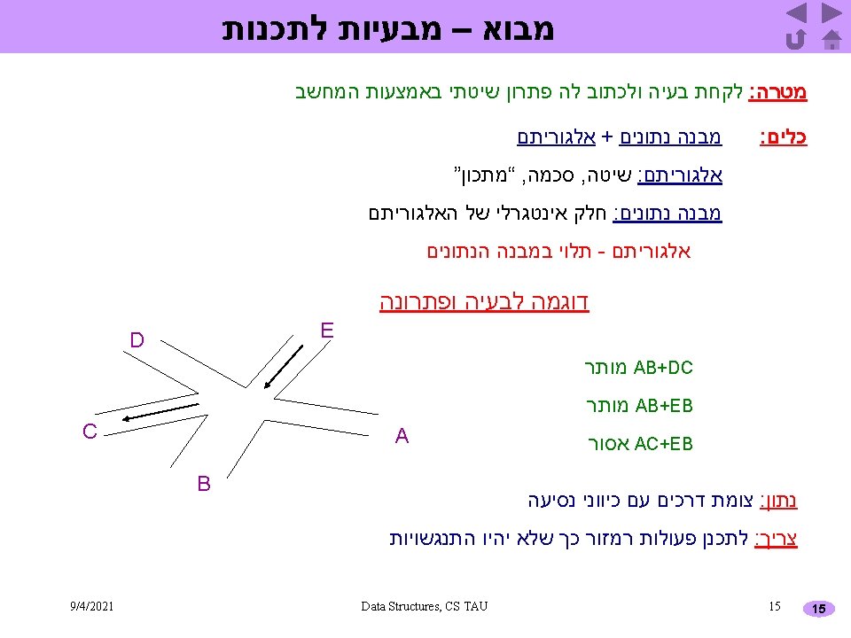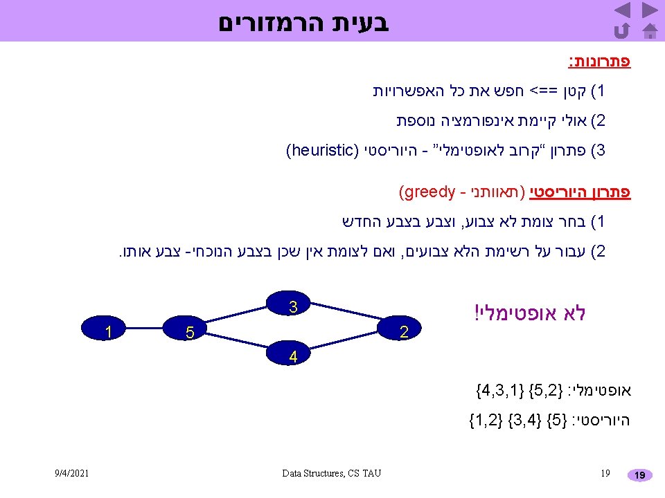 – מגדלי האנוי 4 דוגמא C - תוך שימוש ב B - ל A - • העבר מ ! • אסור שגדול יהיה על קטן פתרון רקורסיבי Proc HANOI(From, To, By, N) (* move top N rings from From to To using By*) if N = 1 move ring from From to top of To end return; else do: CALL HANOI(From, By, To, N - 1); move top of From to To CALL HANOI(By, To, From, N - 1); return; end; 9/4/2021 Data Structures, CS TAU 11 11