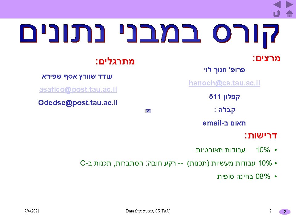חומר לקריאה : ספרים Introduction to Algorithms by: T. H. Cormen, C. E. Leiserson, R. L. Rivest ספר חובה : ספרי עזר Data Structures and Algorithms by: Aho, Hopcroft, Ulman : חומר חובה I. 2, 4 : פרקים Cormen II. 7, 8, 9 10 III. 11, 12, 13 V. 19, 22 כל החומר הנלמד בכיתה 9/4/2021 Data Structures, CS TAU 3 3