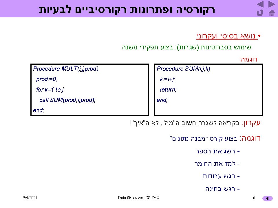 – חיתוך מקל 2 דוגמא מקל : נתון לחתוך את המקל לחתיכות של ס”מ ומטה : צריך פתרון איטרטיבי Proc CUT 1(stick) while length(stick)>1 do: chop a piece of 1 cm from stick end; return; end; פתרון רקורסיבי Proc CUT 2(stick) If length(stick)<1 return; else do: chop a piece of 1 cm from stick let s-stick be the remaining part CALL CUT 2(s-stick) end; return; 9/4/2021 end; Data Structures, CS TAU 8 8