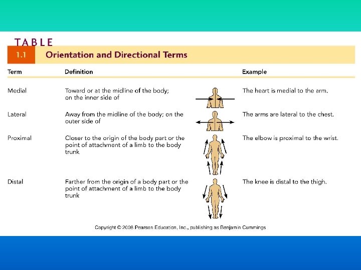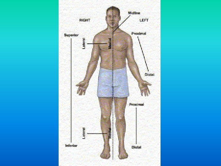 • Person stands erect with feet together and eyes forward • Palms face anteriorly with thumbs pointed away from the body • Right and left always refers to the sides belonging to the person or specimen being viewed – never to the viewer