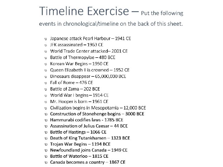 Timeline Exercise Answers Dinosaurs disappear – 65, 000 BCE Civilization begins in Mesopotamia – 12, 000 BCE Construction of Stonehenge begins – 3000 BCE Hammurabi codifies laws - 1785 BCE Death of King Tutankhamen – 1323 BCE Trojan War Begins – 1194 BCE Battle of Thermopylae – 480 BCE Battle of Zama – 202 BCE Assassination of Julius Caesar – 44 BCE Fall of Rome – 476 CE Battle of Hastings – 1066 CE Battle of Waterloo – 1815 CE Canada becomes a country – 1867 CE World War I begins – 1914 CE Japanese attack Pearl Harbor – 1941 CE Newfoundland joins Canada – 1949 CE Korean War Begins – 1950 CE Queen Elizabeth II is crowned – 1952 CE Mr. Hooper is born – 1961 CE JFK assassinated – 1963 CE World Trade Center attacked – 2001 CE