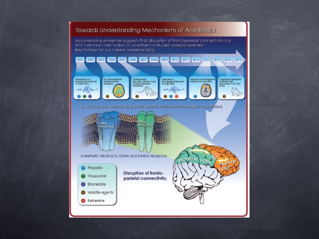 Consciousness Movement Neuronal excitability GABAA receptors Etomidate Propofol Barbiturates Na channels Volatile Anesthetics Excitatory neurotransmission K channels N 2 O Xenon NMDA receptors Ketamine