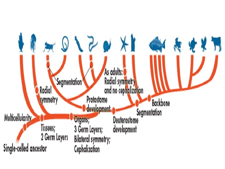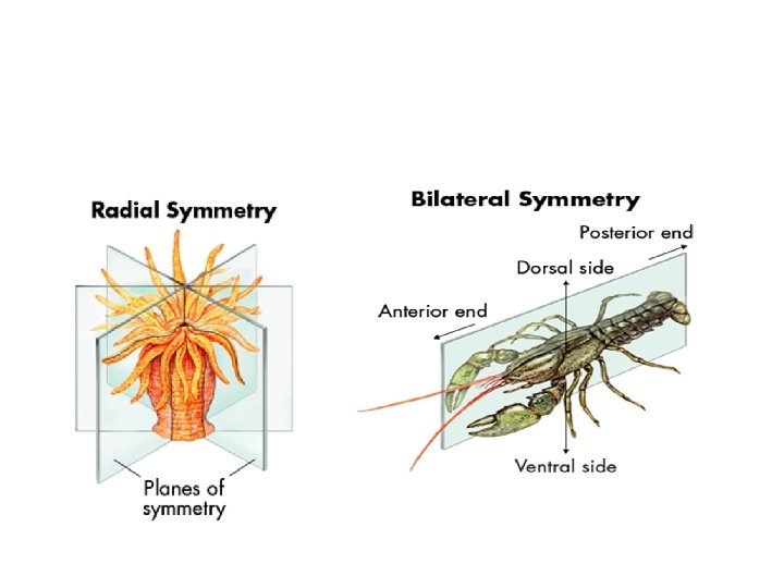 Development, cont. § Body symmetry: • Radial – body parts extend from a central point – Divides into equal halves • Bilateral – Right and left sides are mirror images of each other – Distinct anterior and posterior ends and dorsal and ventral sides