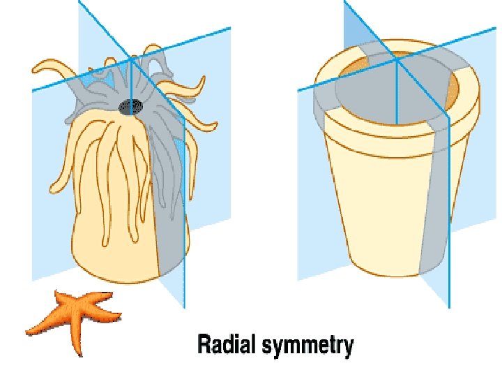 Body Symmetry • Radial symmetry occurs when body parts are arranged around a central point like spokes on a wheel (echinoderms) • Most animals with radial symmetry are sessile (attached) or sedentary (move very little)
