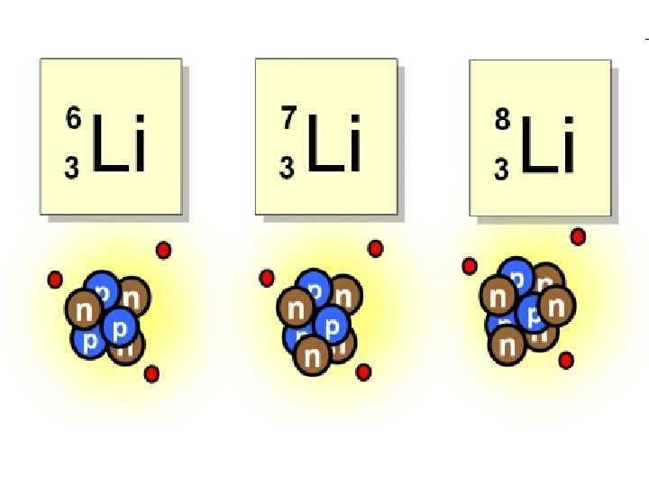 Example: Lithium • 2 Isotopes are found in nature: Lithium-6 and Lithium-7 (Lithium-8 is radioactive and quickly decays) • Atomic mass is listed as 6. 94. • How is that possible? – 94% of Li atoms have an atomic mass of 7, and 6% have an atomic mass of 6. – Avg. Atomic Mass = (7 x. 94) + (6 x. 06)