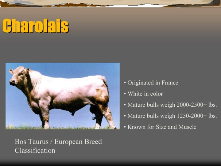 Simmental • First recorded in Switzerland • Large body mass • Light red to dark red with white points • Known for Maternal Characteristics Bos Taurus / European Breed Classification