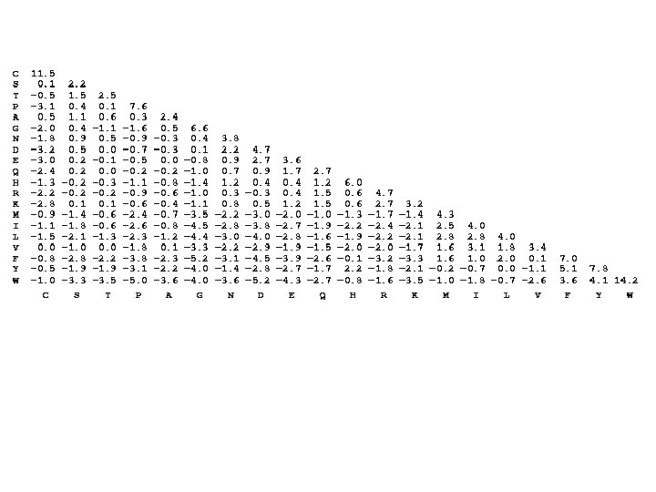 A 2 R -2 6 N 0 0 2 D 0 -1 2 4 PAM 250 matrix C -2 -4 -4 -5 12 Q 0 1 1 2 -5 4 E 0 -1 1 3 -5 2 4 G 1 -3 0 1 -3 -1 0 2 1 -3 1 -2 H -1 2 3 5 6 I -1 -2 -2 -2 -3 -2 5 L -2 -3 -3 -4 -6 -2 -3 -4 -2 2 1 0 -5 1 0 -2 6 K -1 3 M -1 0 -2 -3 -5 -1 -2 -3 -2 2 4 0 6 F -4 -4 -4 -6 -4 -5 -5 -5 -2 1 2 -5 0 5 9 P 1 0 -1 -1 -3 S 1 0 0 -1 0 1 -1 -1 -3 0 -2 -3 1 2 T 1 -1 0 0 -2 -1 0 0 -1 -3 0 1 W -6 0 -1 -1 0 -2 -3 -1 -2 -5 0 -2 2 -4 -7 -8 -5 -7 -7 -3 -5 -2 -3 -4 Y -3 -4 -2 -4 0 -4 -4 -5 0 -1 -1 -4 -2 0 -6 -2 -5 17 7 -5 -3 -3 B 0 -1 2 3 -4 1 2 0 1 -2 -3 1 -2 -5 -1 0 0 -5 -3 -2 2 Z 0 0 1 3 -5 3 3 -1 2 -2 -3 0 -2 -5 0 0 -1 -6 -4 -2 2 3 A R N D Q E H K P S B Z I L 2 -1 -1 -1 0 10 0 -2 -2 -2 -1 -2 G 2 -2 3 V C 4 6 M F 0 -6 -2 T W Y 4 V